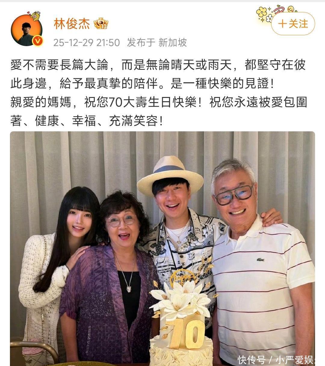 12月30日,娱乐圈知名歌手林俊杰官宣自己小20岁女友的消息持续发酵。这位号称是行走CD机的44岁男歌手借着自己母亲70岁大寿的契机直接分享出全家四口的合照,正式公开自己和女友七七的恋情。