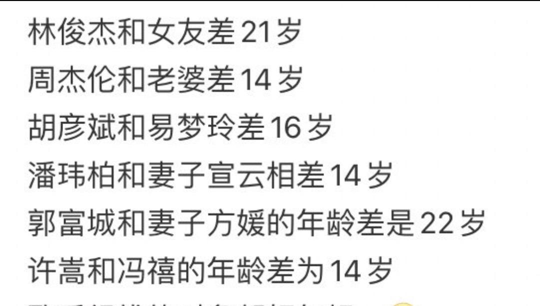 再横向对比一下周杰伦、胡彦斌、许嵩以及郭富城等人都是找了小自己十好几岁的小女朋友由此可见,娱乐圈的男明星到中年之后,还是喜欢年轻一点的另一半。